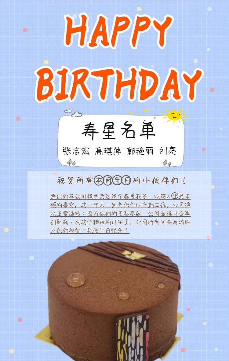 星瑞感謝你們的付出,今天特地準備了精美的蛋糕,為你們送上生日祝福,并對你們?yōu)楣咀龀龅呢暙I表示感謝!愿你們: